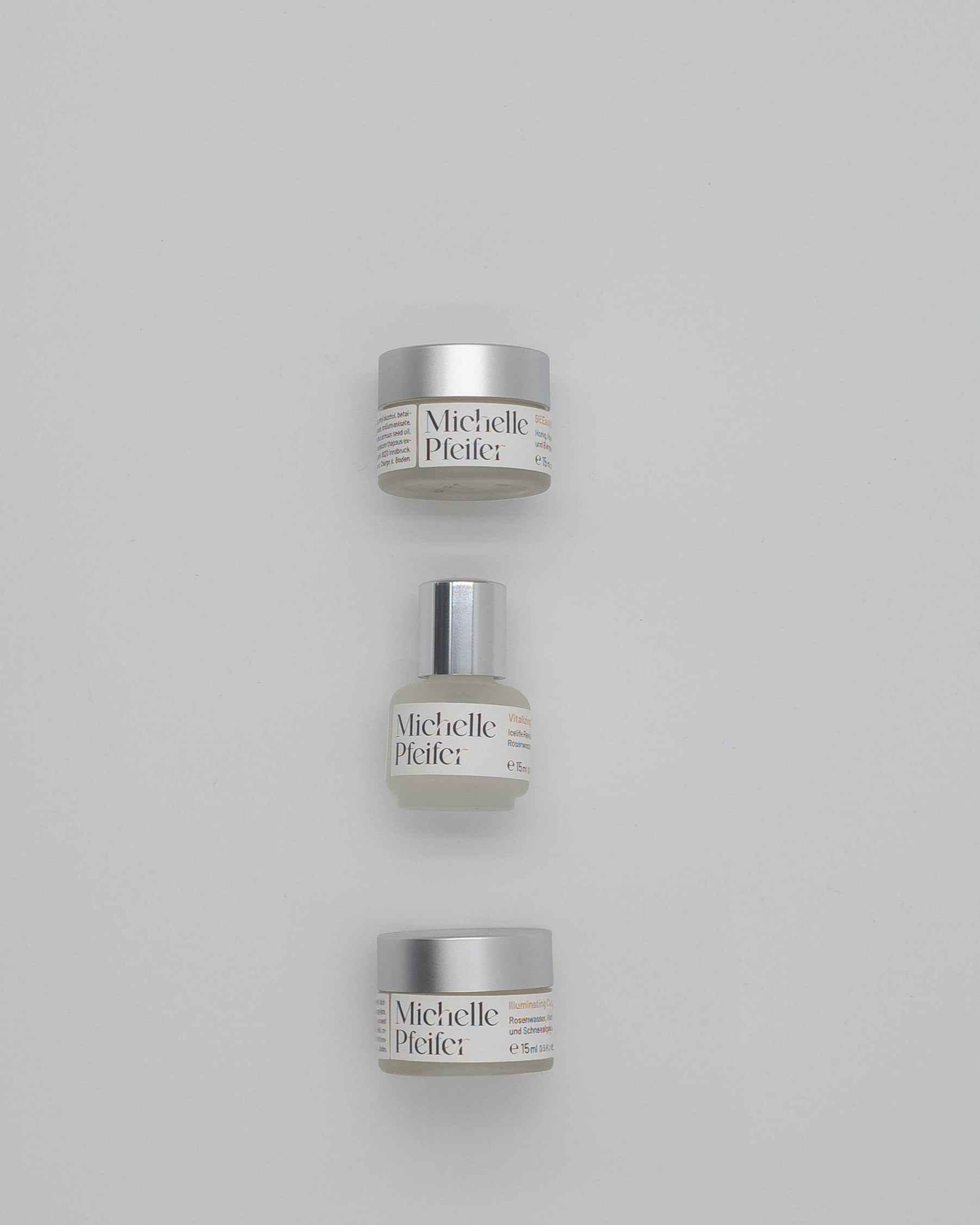 Verpackung: mattierter Glastiegel & Flaschen mit silbermattem Verschluss